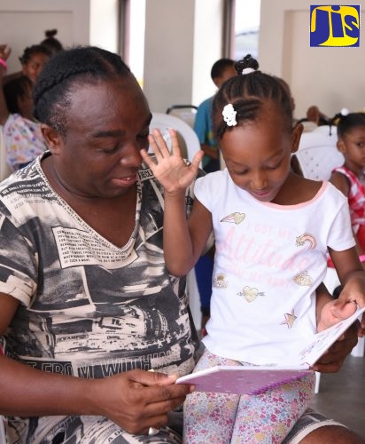 Beneto Lazarus reads with his daughter, Shanika, at Parliament’s annual Christmas treat for children held in the parking lot at 81 Duke Street, Kingston, on December 19.