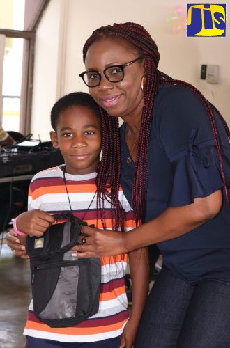 Young Miguel Walters (left) receives a lunch bag from Corporate Services Director, Houses of Parliament, Cheryl Gibson, at Parliament’s annual Christmas treat for children, held in the parking lot at 81 Duke Street, Kingston, on December 19.