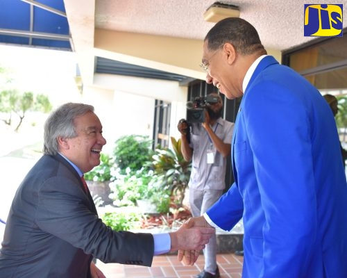 Prime Minister, the Most Hon. Andrew Holness (right), exchanges a warm handshake with United Nations (UN) Secretary-General, His Excellency António Guterres, just before a bilateral meeting at the Office of the Prime Minister on Monday (May 15). They were joined by members of the Cabinet and the visiting UN delegation. The meeting is part of engagements during the UN Secretary-General’s two-day working visit to the island from May 14 to 15.