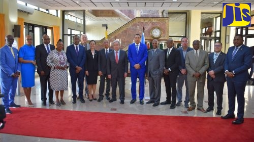 Prime Minister, the Most Hon. Andrew Holness (seventh right) and United Nations (UN) Secretary-General, His Excellency António Guterres (ninth left), are flanked by members of the Cabinet, just before holding bilateral talks at the Office of the Prime Minister on Monday (May 15). The bilateral meeting is part of engagements during the UN Secretary-general’s two-day working visit to the island from May 14 to 15.