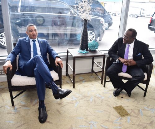 Prime Minister, the Most Hon. Andrew Holness (left), converses with Bahamian Deputy Prime Minister and Minister of Tourism, Investment and Aviation, Hon. Chester Cooper, on arrival at the Lynden Pindling International Airport in Nassau on Wednesday (February 15), for the CARICOM Heads of Government meeting. The Prime Minister returns to the island later this afternoon.