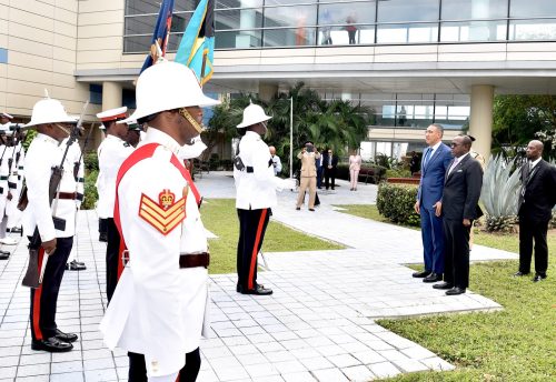 Prime Minister, the Most Hon. Andrew Holness (left), and Bahamian Deputy Prime Minister and Minister of Tourism, Investment and Aviation, Hon. Chester Cooper, stand at attention during a ceremony at the Lynden Pindling International Airport in Nassau on Wednesday (February 15) to welcome Prime Minister Holness. The Prime Minister is in The Bahamas for the CARICOM Heads of Government meeting. He returns to the island later this afternoon.