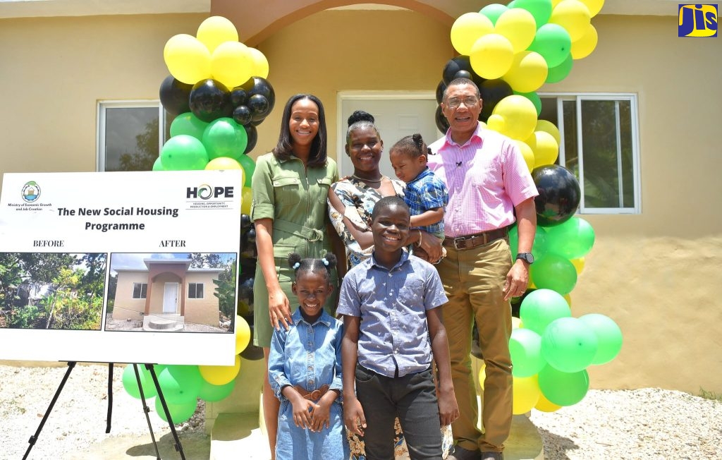 Prime Minister, the Most Hon. Andrew Holness (right), and Member of Parliament for Manchester Central, Rhoda Moy Crawford (left), share a moment with Faith-Ann Thomas (centre) and her children, during the handover of a three-bedroom house to the family on April 14 in Comfort, Manchester. The unit was built under the New Social Housing Programme (NSHP), which is geared at improving the housing condition of the country’s most vulnerable population.