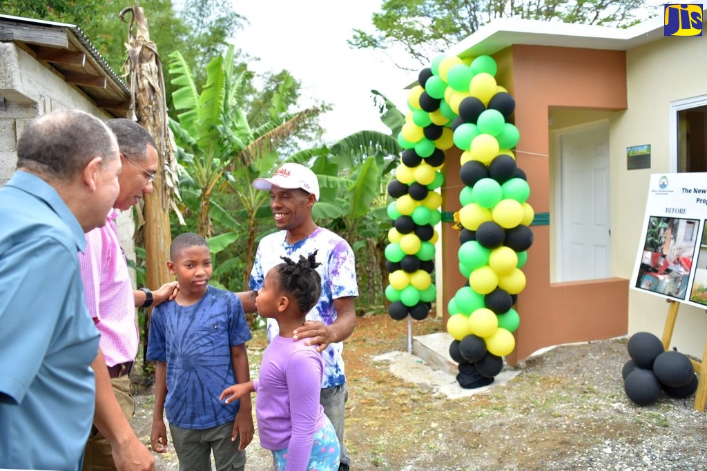 Prime Minister, the Most Hon. Andrew Holness (second left), engages with New Social Housing Programme (NSHP) beneficiary, Roger Mitchell (right) and his children, Roger Jr. (cemtre), and Brianna, during the presentation of a three-bedroom unit to the family on April 14 in Straun Castle, Manchester. Member of Parliament for Manchester North East, Hon. Audley Shaw, shares the moment.