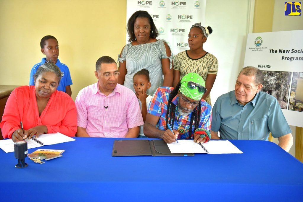 Prime Minister, the Most Hon. Andrew Holness (seated second left), observes while recipient of a three-bedroom unit under the New Social Housing Programme (NSHP), Selvin Evans (second right), signs the social contact for the unit on April 14 in Providence Day, Manchester. Others looking on (from left) are Chairperson of the Oversight Committee for the NSHP, Judith Robb Walters; Mr. Evans’ family members and Member of Parliament for Manchester North East, Hon. Audley Shaw.