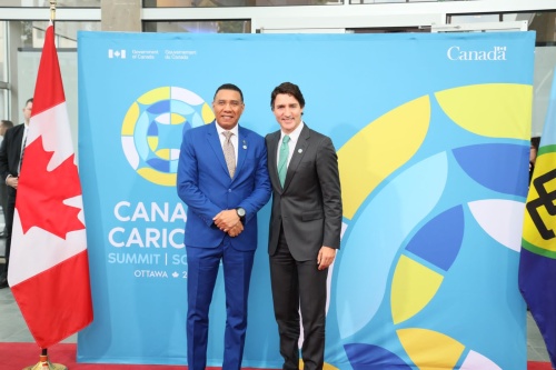 Prime Minister, the Most Hon. Andrew Holness (left), and Prime Minister of Canada, Rt. Hon. Justin Trudeau, exchange greetings at the Canada-CARICOM summit being held in Ottawa from October 17 to October 19. The three-day summit, under the theme: ‘Strategic Partners for a Resilient Future’, features discussions on issues such as trade and investment, climate resilience, access to finance, regional security collaboration, and the crisis in Haiti.