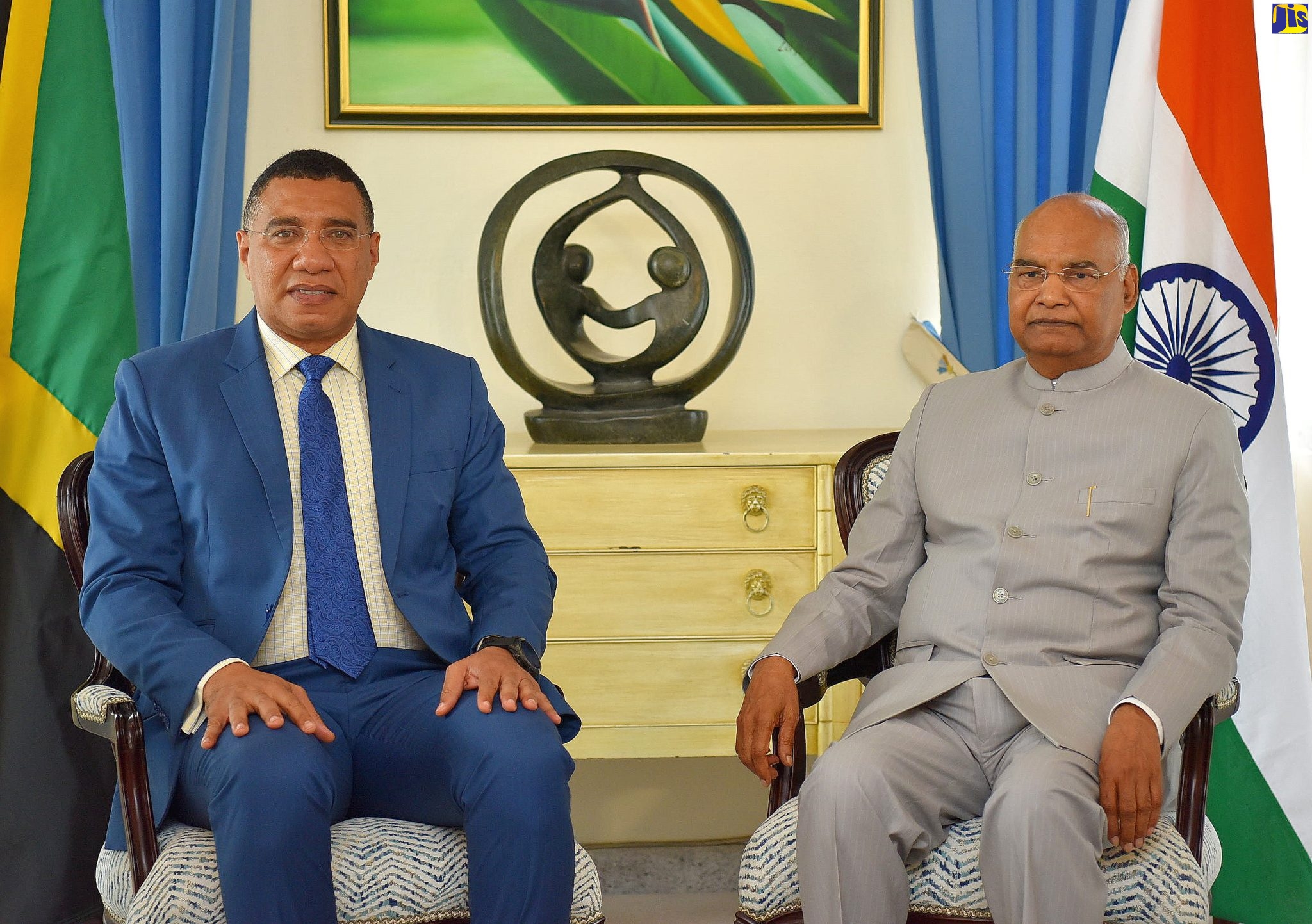 Prime Minister, the Most Hon. Andrew Holness (left), and President of the Republic of India, His Excellency the Hon. Ram Nath Kovind, pictured during a courtesy call at the Office of the Prime Minister (OPM) on Monday (May 16). President Kovind is visiting the island on a four-day State visit from May 15 to 18. President Kovind’s visit coincides with Jamaica’s 60th Independence anniversary celebrations and also marks 60 years of diplomatic relations between Jamaica and India.