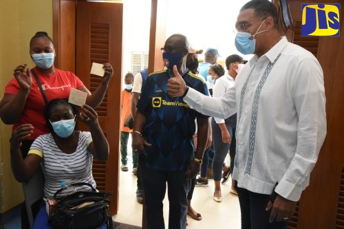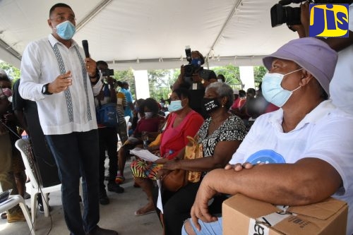 Prime Minister, the Most Hon. Andrew Holness (left), addressing persons who turned out to receive the coronavirus (COVID-19) vaccine at the Jamaica-China Goodwill Infant School at Olympic Way, West Central St. Andrew, on Friday, September 10. The Prime Minister visited the site as part of his vaccine mobilisation and public education campaign.