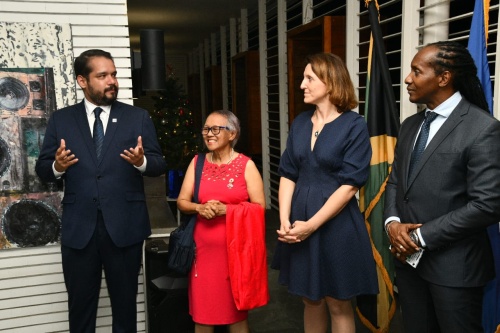 Minister of State in the Ministry of Foreign Affairs and Foreign Trade, Hon. Alando Terrelonge (right), listens to remarks from Canada’s High Commissioner to Jamaica, His Excellency Mark Berman (left), at the Prestige Dinner held in honour of the Jamaica Red on Tuesday (December 9), at the Embassy of France in Kingston. Sharing in the discussion (from left) are President of Jamaica Red Cross, Allasandra Chung, and Ambassador of France to Jamaica, Her Excellency Marianne Ziss.