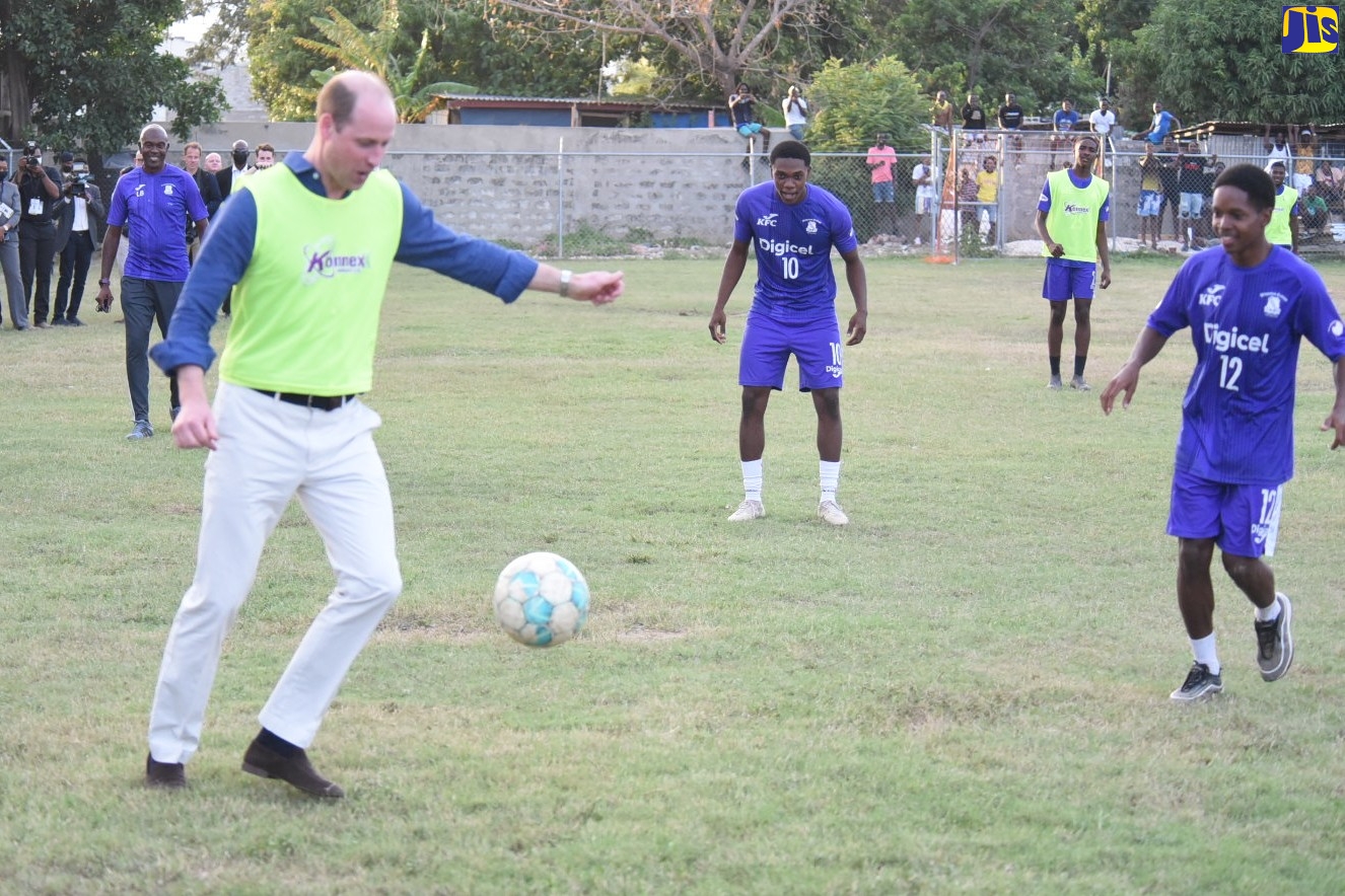 His Royal Highness, The Duke of Cambridge, plays a game of football during a visit to the community of Trench Town in Kingston, just a few hours after arriving in the island on March 22. Their Royal Highnesses, The Duke and Duchess of Cambridge are on an Official Visit to Jamaica from March 22 to 24. The visit forms part of celebrations marking the 70th Anniversary (Platinum Jubilee) of the Coronation of Her Majesty The Queen.