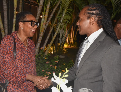 State Minister in the Ministry of Foreign Affairs and Foreign Trade, Hon. Alando Terrelonge (left), greets United Nations Children's Fund (UNICEF) Regional Director for Latin America and the Caribbean, Roberto Benes (right), as UNICEF Jamaica Representative, Olga Isaza, looks on. Mr. Terrelonge gave an address at a reception held in honour of Mr. Benes in Kingston on Wednesday (December 10).