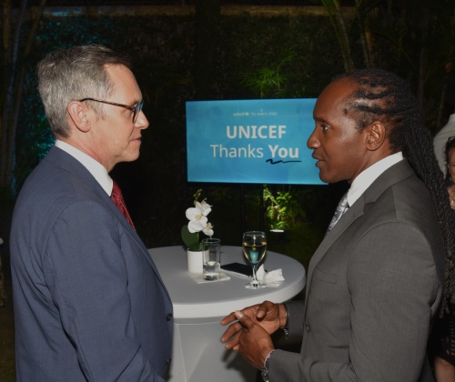 State Minister in the Ministry of Foreign Affairs and Foreign Trade, Hon. Alando Terrelonge (right), engages in conversation with United Nations Children’s Fund (UNICEF) Regional Director for Latin America and the Caribbean, Roberto Benes, at a reception to mark the Regional Director’s visit to the island. The reception was held in Kingston on Wednesday (December 10).