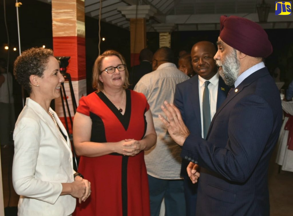 Minister of Foreign Affairs and Foreign Trade, Senator the Hon. Kamina Johnson Smith (right), engages with (from left) Canadian High Commissioner to Jamaica, Her Excellency, Emina Tudakovic and Minister of International Development and Minister responsible for the Pacific Economic Development Agency of Canada, Hon. Harjit Sajjan. Occasion was a reception to commemorate 60 years of Canada-Jamaica development cooperation, at the official residence of the Canadian High Commissioner in Kingston on Wednesday (January 11).