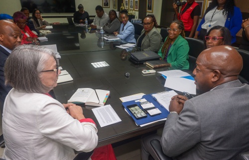 Minister of Labour and Social Security, Hon. Pearnel Charles Jr. (right), and President of the International Federation of Red Cross and Red Crescent Societies (IFRC), Kate Forbes (left), lead discussions during a courtesy call at the Ministry’s conference room in Kingston on Tuesday (January 13) as members of the Ministry and Red Cross teams look on.