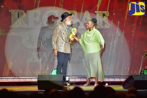 Minister of Culture, Gender, Entertainment and Sport, Hon. Olivia Grange (right), looks on as Jamaican entertainer, Winston “Yellowman” Foster, greets the audience during the Reggae Gold Awards presentation ceremony and 2024 Jamaica Music Museum Hall of Fame Inductions on Thursday (February 29) at the National Indoor Sports Centre in Kingston.