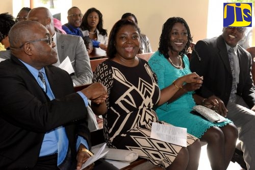 Chief Executive Officer (Acting), Registrar General’s Department (RGD) Desmond Davis (left) joins hand with (from second left), Director of Finance and Administration, RGD, Debbie-Ann Martin; Director of Human Resource Management and Development, RGD, Nerine Belnavis White; and Director of Records Information Management, RGD, Alvin Morris, during a Thanksgiving Service to celebrate the 140th anniversary of the agency at the Spanish Town Methodist Church, White Church Street, St. Catherine, on November 24.