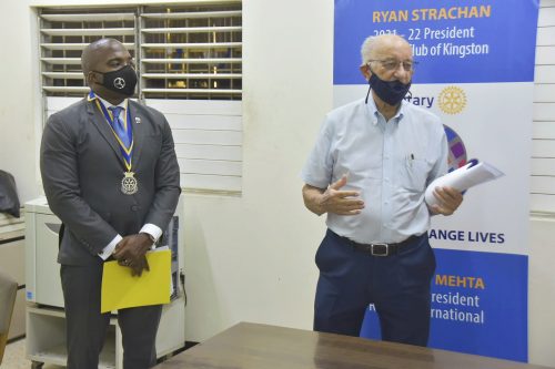 Chairman of the Young Men’s Christian Association’s (YMCA) 100th Anniversary Committee and Past District Governor, Rotary International, Mike Fennel (right), expresses his gratitude after the Association was presented with a cheque valued at $370,000 by the Rotary Club of Kingston to provide well-needed funding support. President of the Club, Ryan Strachan (also pictured) handed over the cheque during a brief ceremony at the YMCA’s Hope Road location in St. Andrew on Wednesday (Nov. 3). The donation is in keeping with the Club’s community development initiative. The YMCA falls under the auspices of the Ministry of Culture, Gender, Entertainment and Sport. Photo: Donald De La Haye