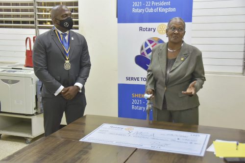 General Secretary/Administrator at the Young Men’s Christian Association (YMCA), Sarah Newland Martin (right), is a picture of elation and gratitude following the Rotary Club of Kingston’s donation of $370,000, which will provide well-needed funding support for the YMCA. President of the Club, Ryan Strachan (also pictured) handed over a representational cheque during a brief ceremony at the YMCA’s Hope Road location in St. Andrew on Wednesday (Nov. 3). The donation is in keeping with the Club’s community development initiative. The YMCA falls under the auspices of the Ministry of Culture, Gender, Entertainment and Sport. Photo: Donald De La Haye