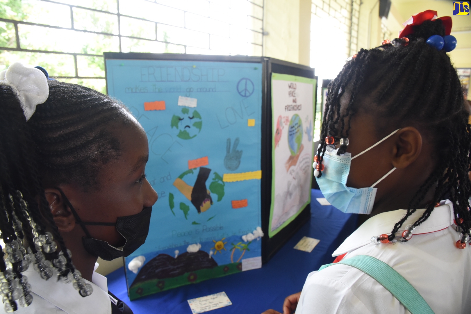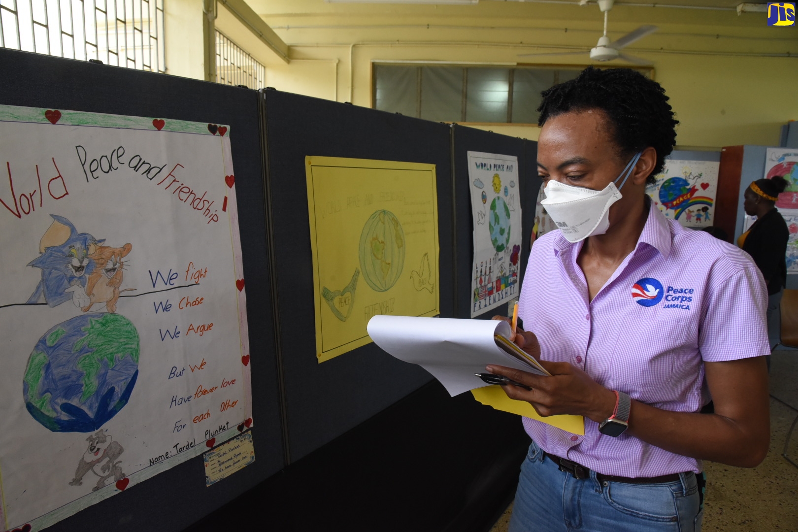 Peace Corps Jamaica Programme Manager, Susan Walden, judges entries in the Social Development Commission/Peace Corps Jamaica public speaking and poster design competition at Camp Cape Clear in Highgate, St. Mary, recently. Eleven primary schools, four early-childhood institutions and three high schools from the Highgate Development Area participated in the competition, which was held under the theme ‘World Peace and Friendship’.Grade-six students at Zion Hill Primary School in St. Mary, Shabray Cummings (left) and Macaulay Byfield, view their institution’s submission, titled ‘Friendship Makes the World Go Round’, which was entered in the recent Social Development Commission/Peace Corps Jamaica public speaking and poster design competition. The event was held at Camp Cape Clear in Highgate, St. Mary. The competition, which attracted 11 primary schools, four early-childhood institutions and three high schools from the Highgate Development Area, was held under the theme ‘World Peace and Friendship’.