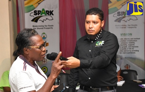Resident of St. Mary South Eastern, Jennifer Williams (left), poses a question during a Shared Prosperity Through Accelerated Improvement to our Road Network (SPARK) Programme Consultation for the Castleton and Richmond Divisions, held at the Richmond Community Centre in the parish on Thursday (June 6). Assisting her is Constituency Development Fund Programme Management Unit (CDFPMU) Representative, Nackadian Jones.
