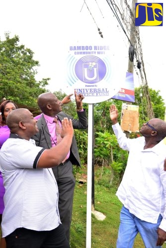 Member of Parliament, St. Catherine South Western, Hon. Everald Warmington (right), points to the community WI-FI sign for Bamboo Ridge, St. Catherine, at the launch of the service on Friday (February 10). Others looking on are (from left) Councillor, Old Harbour North Division, Keith Knight and Chief Executive Officer, Universal Service Fund (USF), Daniel Dawes.