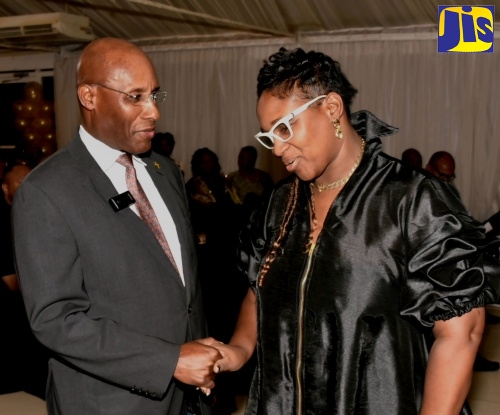 Minister of Industry, Investment and Commerce, Senator Aubyn Hill (left), greets Chief Executive Officer of Stationery World & Book Centre Limited, Joy Scott, during the company’s 21st anniversary celebrations, held at the Terra Nova All-Suite Hotel in St. Andrew on Wednesday (April 10).
