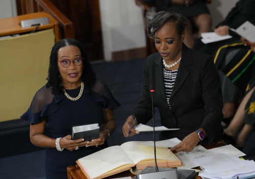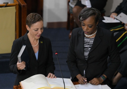 Minister of Foreign Affairs and Foreign Trade and Leader of Government Business in the Senate, Senator the Hon. Kamina Johnson Smith, takes the Oath of Allegiance, during the swearing-in of members of the Upper House at Gordon House on September 18. Observing is Clerk to the Houses of Parliament, Colleen Lowe.Leader of Opposition Business in the Senate, Senator Donna Scott Mottley, takes the Oath of Allegiance during the swearing-in of members of the Upper House at Gordon House on September 18. Observing is Clerk to the Houses of Parliament, Colleen Lowe.