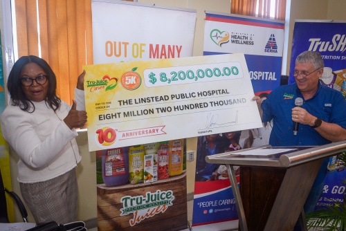 Managing Director of Trade Winds Citrus Limited, Peter McConnell (right), hands over a ceremonial cheque representing a $8.2 million donation to the Linstead Hospital, to Chief Executive Officer (CEO) of the public health facility, Camille Wallen-Panton. The presentation took place on Tuesday (September 23) at the hospital in St. Catherine. The funds raised through the annual Tru-Juice 5K Run/Walk event, will assist with the purchase of medical equipment and resources for the paediatric ward.