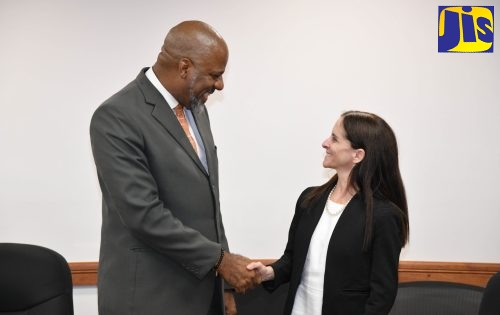 Director General, Planning Institute of Jamaica (PIOJ), Dr. Wayne Henry, shakes hands with United Nations Development Programme (UNDP) Deputy Regional Director for Latin America and the Caribbean, Linda McGuire, during her courtesy call at the PIOJ’s office in Kingston on Wednesday (April 19).