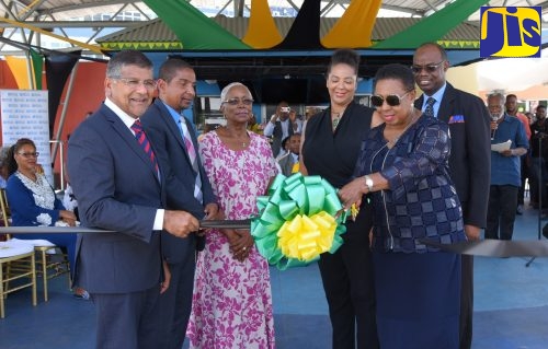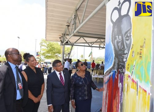 Minister of Culture, Gender, Entertainment and Sport, Hon. Olivia Grange (right), views an art piece done by United Kingdom Artist, Honey Williams, at the official unveiling of the Windrush Public Art Murals at the Norman Manley International Airport on August 29. With the Minister are (from left) Senior Director, Commercial Development and Planning, Airports Authority of Jamaica, Alfred McDonald; Former Director, British Council Jamaica, Olayinka Jacobs-Bonnick; and British High Commissioner to Jamaica, His Excellency Asif Ahmad.Minister of Culture, Gender, Entertainment and Sport, Hon. Olivia Grange (right), cuts the ribbon to officially unveil the Windrush Public Art Murals at the Norman Manley International Airport in Kingston, on August 29. Others (from left) are British High Commissioner to Jamaica, His Excellency Asif Ahmad; Mayor of Kingston, Senator Councillor Delroy Williams; Windrush Generation Representative, Carmen Adasa Brandison; Former Director, British Council Jamaica, Olayinka Jacobs-Bonnick; and Senior Director, Commercial Development and Planning, Airports Authority of Jamaica, Alfred McDonald.