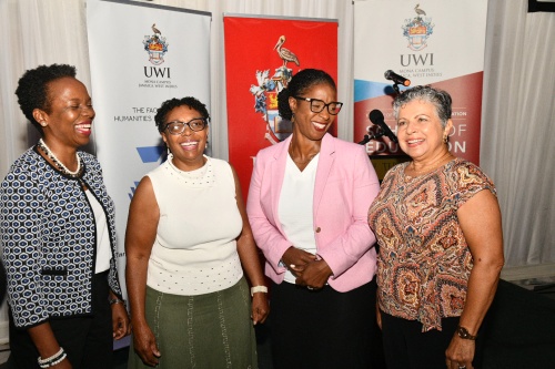 Assistant Chief Education Officer in the Tertiary Education Unit, Ministry of Education, Youth and Information, Dr. Tamika Benjamin (second right), shares in light conversation with (from left), Professor of Curriculum Studies in the School of Education, University of the West Indies (UWI), Mona campus, Professor Carmel Roofe; Coordinator of the Teacher Education Practicum in the School of Education, Dr. Dian McCallum; and Senior Lecturer in the School of Education, Dr. Carol Hordatt Gentles. Occasion was an Education Forum staged by the School of Education at the Terra Nova All-Suite Hotel in Kingston on Tuesday (May 20) under the theme ‘Future Proofing Teaching: A School of Education, UWI Mona Perspective’.