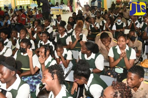 Students of Vere Technical High School participate in the awards ceremony for the ‘Just Medz It’ jingle competition held at the school’s campus in Clarendon on May 19.