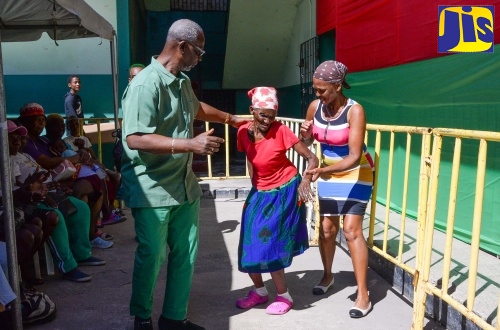 Minister of Local Government and Community Development, Hon. Desmond McKenzie (left), assists an elderly resident during Wednesday’s (December 20) annual West Kingston Senior Citizens’ Treat, held at Tivoli Gardens Community Centre in Kingston.