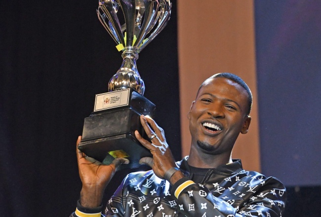 The 2023 Jamaica Gospel Star, Oral Lawson, proudly displays his trophy at the grand finals of the Jamaica Cultural Development Commission (JCDC)-organised competition, which was held at the National Arena on August 2.