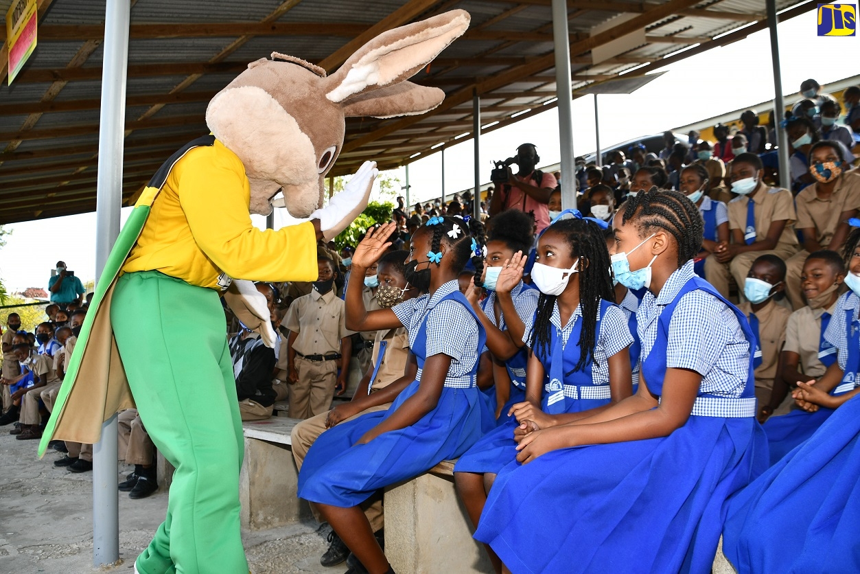 The Child Protection and Family Services Agency (CPFSA) mascot, ‘Mr. Protector’ (left), interacts with students of the Bamboo Primary and Junior High School in St. Ann during a school tour on Tuesday (May 3) to promote the importance of child protection and the Agency’s 211 Child Abuse Reporting Hotline.