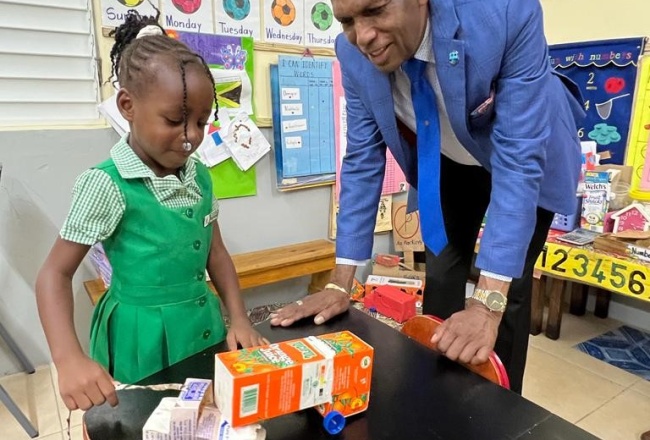 Chief Executive Officer, Culture, Health, Arts, Sports and Education (CHASE) Fund, Wilford “Billy” Heaven, admires a truck made from juice boxes by Savanna-la-Mar Infant School student, Leana Barker.
