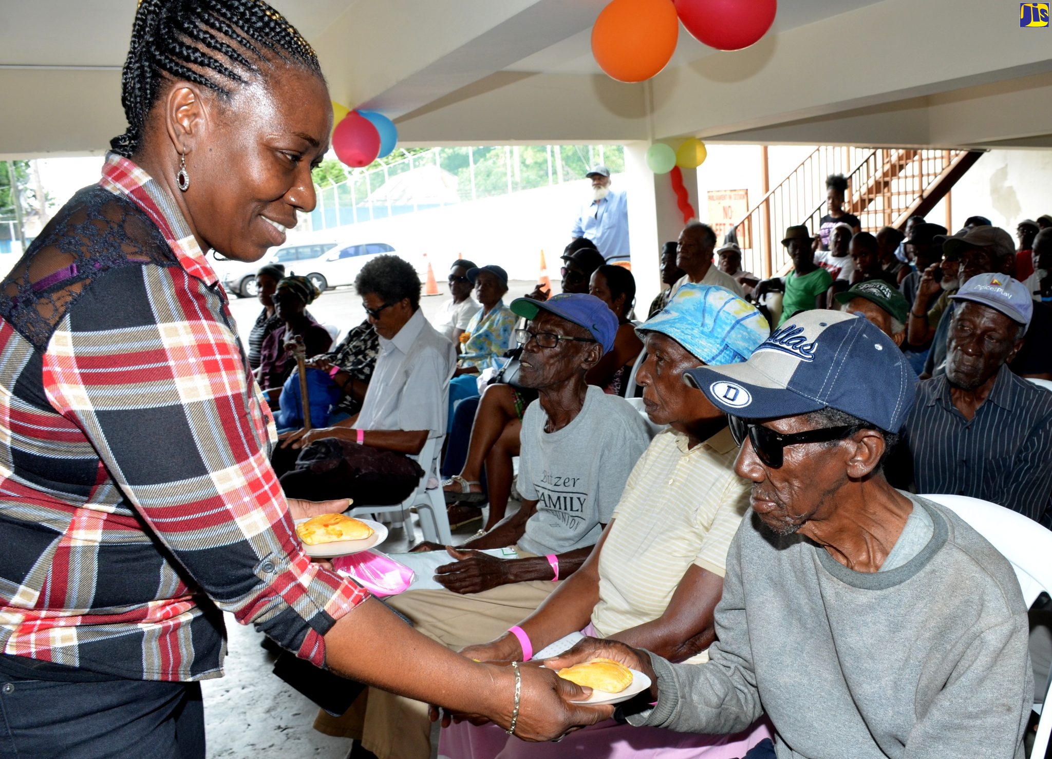 Employee at the Houses of Parliament, Sonia Smith (left), serves dessert to senior citizens from the community of Mark Lane, at a treat held at the Houses of Parliament parking lot, 81 Duke Street, Kingston, on December 18.
