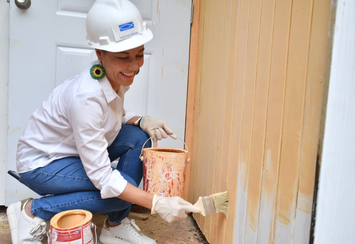 Minister of Foreign Affairs and Foreign Trade, Senator the Hon. Kamina Johnson Smith, paints a section of a house constructed in Chatham, St. James, under the ‘Build A House in One Day’ Project, which involved a partnership between the United States-based Housing Foundation of America, and Food for the Poor. The project was one of 14 initiatives undertaken across the island for Diaspora Day of Service on Thursday (June 20).
