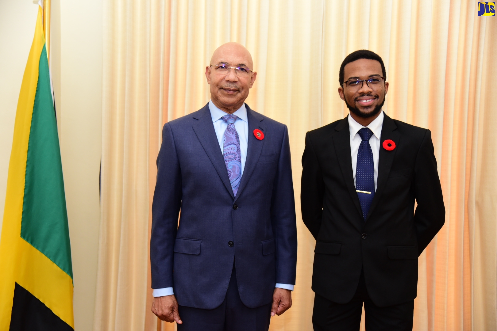 Governor-General, His Excellency the Most Hon. Sir Patrick Allen (left), with 2023 Rhodes Scholar for Jamaica, David Salmon, following the announcement ceremony at King’s House on November 10.