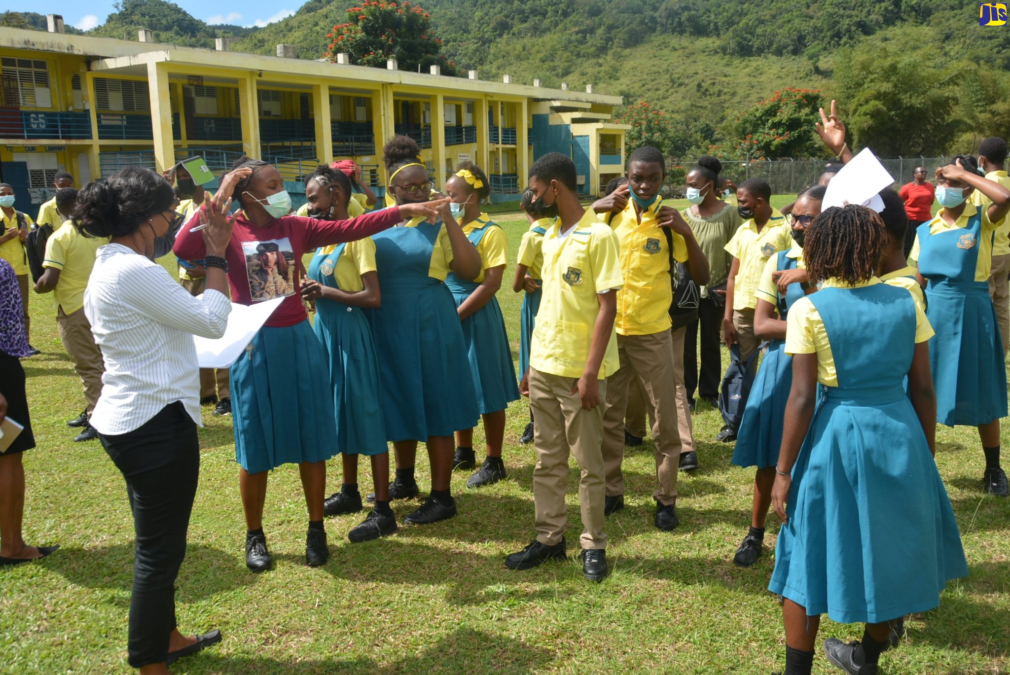 Grade nine teacher of Lewisville High School in St. Elizabeth, Obena Gordon-Atkinson (left), performs a roll call of students following an earthquake and evacuation drill staged at the school recently.