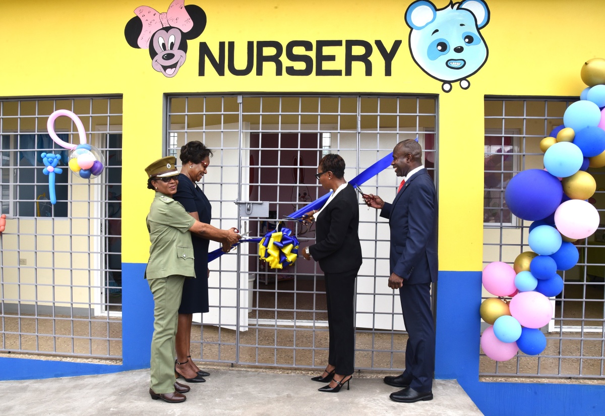 State Minister in the Ministry of National Security, Hon Juliet Cuthbert-Flynn (second right), is assisted by (from left) Superintendent, South Camp Adult Correctional Centre, Joycelyn Roach Spencer; Permanent Secretary in the Ministry, Ambassador Alison Stone Roofe; and Commissioner of Corrections, Brigadier (Ret'd) Radgh Mason, in cutting the ribbon to officially open a newly built infant nursery for incarcerated expectant mothers and their babies, on Tuesday (September 24). The nursery is located at the South Camp Adult Correctional Centre in Kingston.