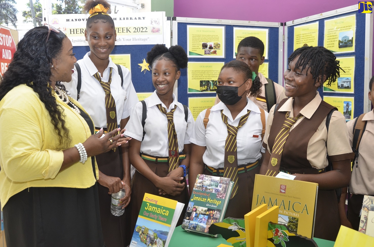 Jamaica’s Honorary Consul to Antigua and Barbuda, Dr. Onika Campbell (left), interacts with students of Merlene Ottey High School in Hanover, during the recent Jamaica 60 Heritage Lecture and Exhibition. The event was hosted by the Hanover Parish Library in partnership with the Jamaica Information Service (JIS).