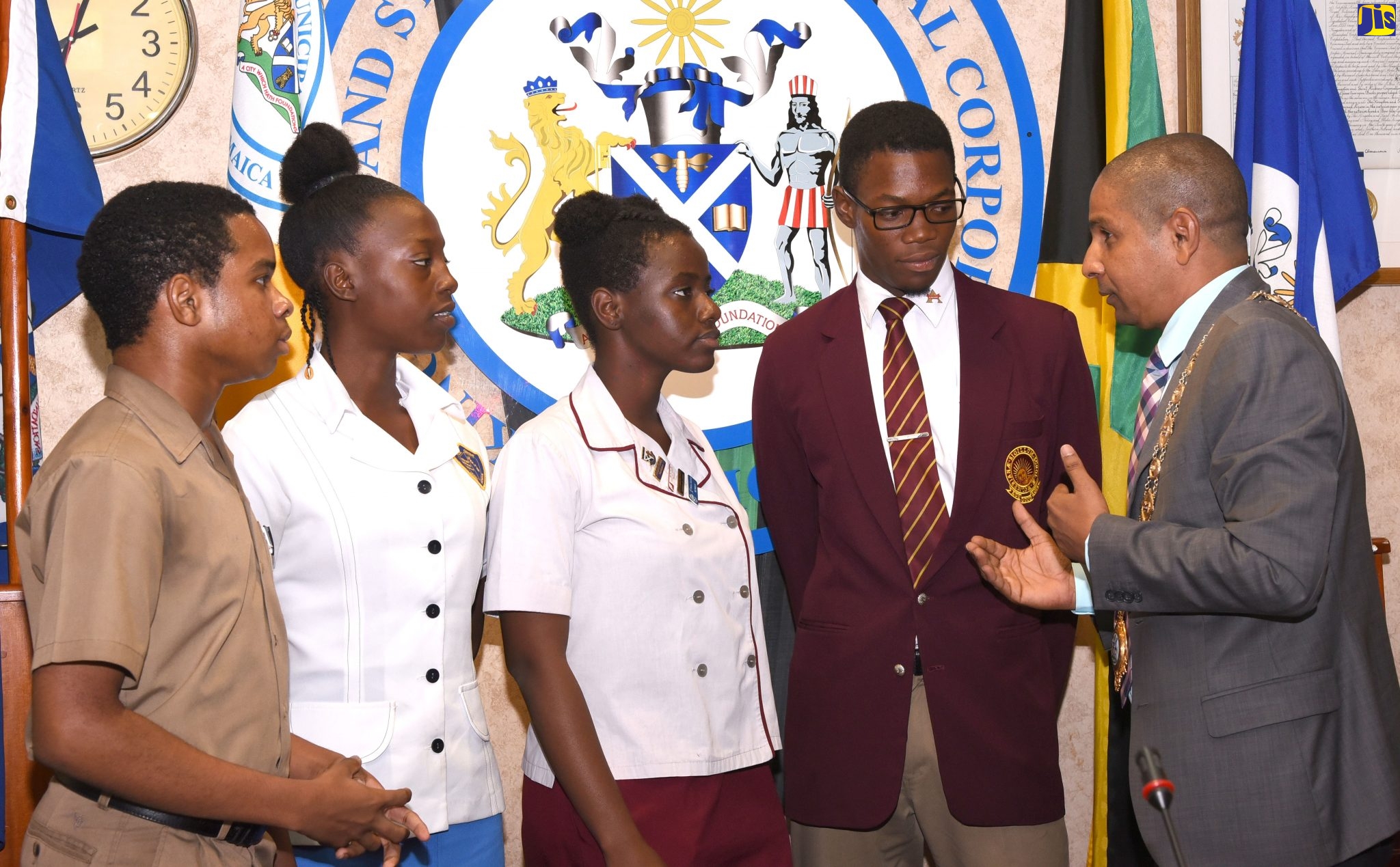 Mayor of Kingston, Senator Councillor Delroy Williams (right), offers words of encouragement to some of the newly elected members of the Kingston and St. Andrew Municipal Corporation (KSAMC) Youth Council at the municipal corporation’s downtown Kingston offices on Tuesday (November 12). The youth representatives (from left) are Chaplain, Khalil Satchell; Deputy Junior Mayor, Raneeka Cain; Chief Executive Officer, Danielle Jonas; and Junior Mayor, Jean-Claude Walters Dunn.