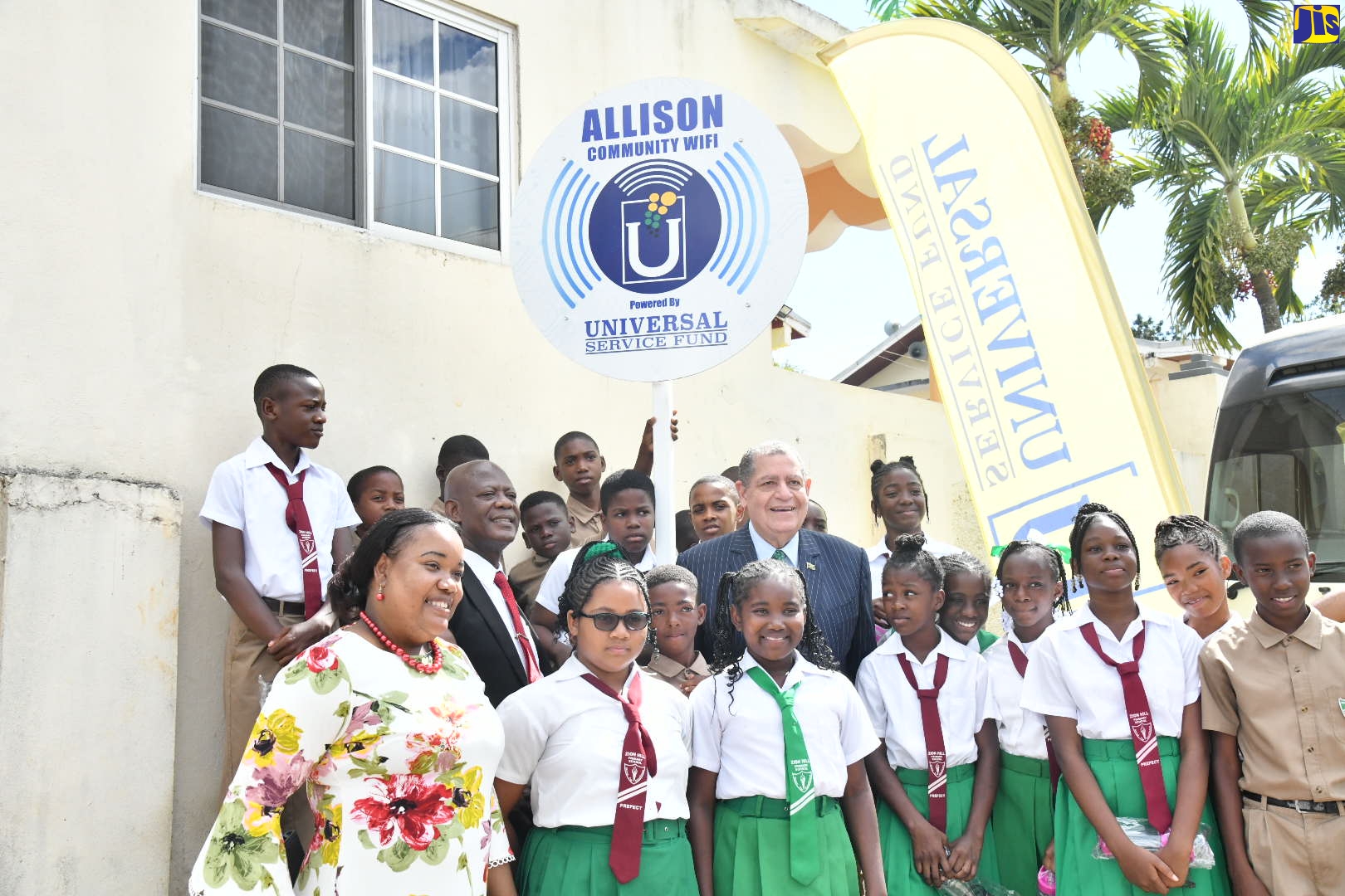 Member of Parliament, Manchester North Eastern, Hon. Audley Shaw (centre) and Chief Executive Officer of the Universal Service Fund (USF), Daniel Dawes (second left), are surrounded by students from the Zion Hill Primary School at the launch of free community WI-FI in Allison, Manchester, on Friday (January13).