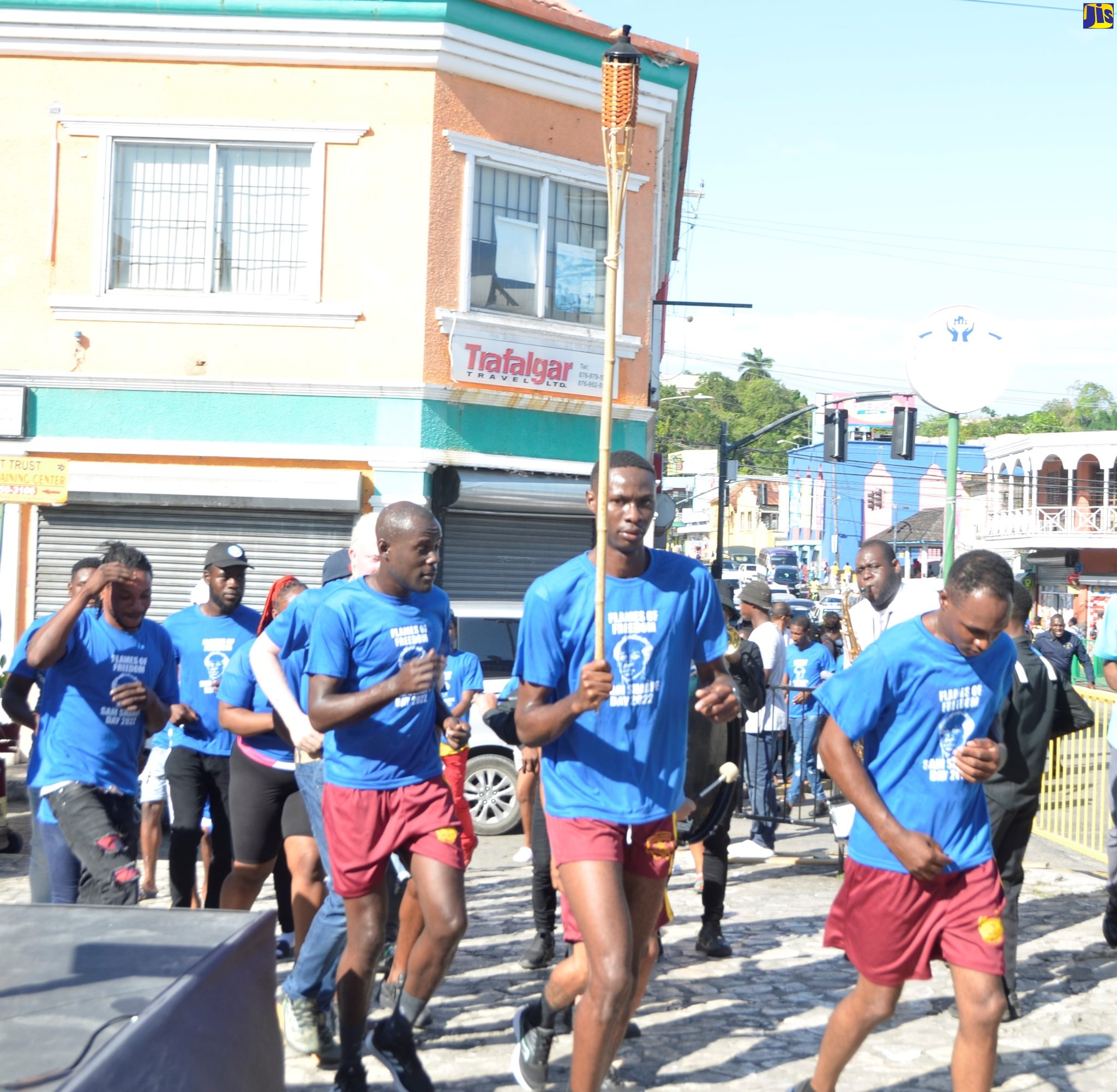 Members of the Jamaica Defence Force and youth representatives from St. James Southern run into Sam Sharpe Square, St. James, with the Sam Sharpe Flames of Freedom torch, on Wednesday, December 28. The run formed part of the Sam Sharpe Flames of Freedom celebrations held across the parish on December 22 and December 28.