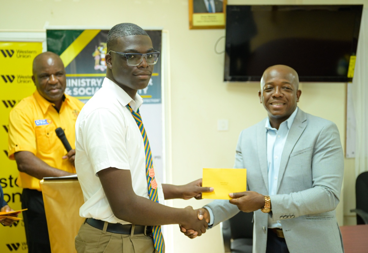 Minister of Labour and Social Security, Hon. Pearnel Charles Jr., presents an academic grant to Roger Clarke High School student Michael Blake, during a handover ceremony, held at the St. Elizabeth Technical High School in Santa Cruz, on June 5. The 22 grants to students in St. Elizabeth were provided by Jamaican farm workers at Gebbers Farms in Washington, United States.