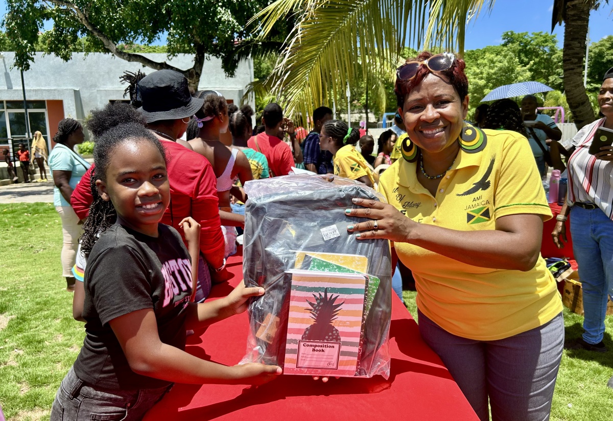 Minister at Alleluia Ministries International (AMI), Nichole Chattoo (right), presents a backpack and school supplies to Jaida Gardner during a Back-to-School Outreach at Harmony Beach Park, Montego Bay, St James, on Saturday (August 16).