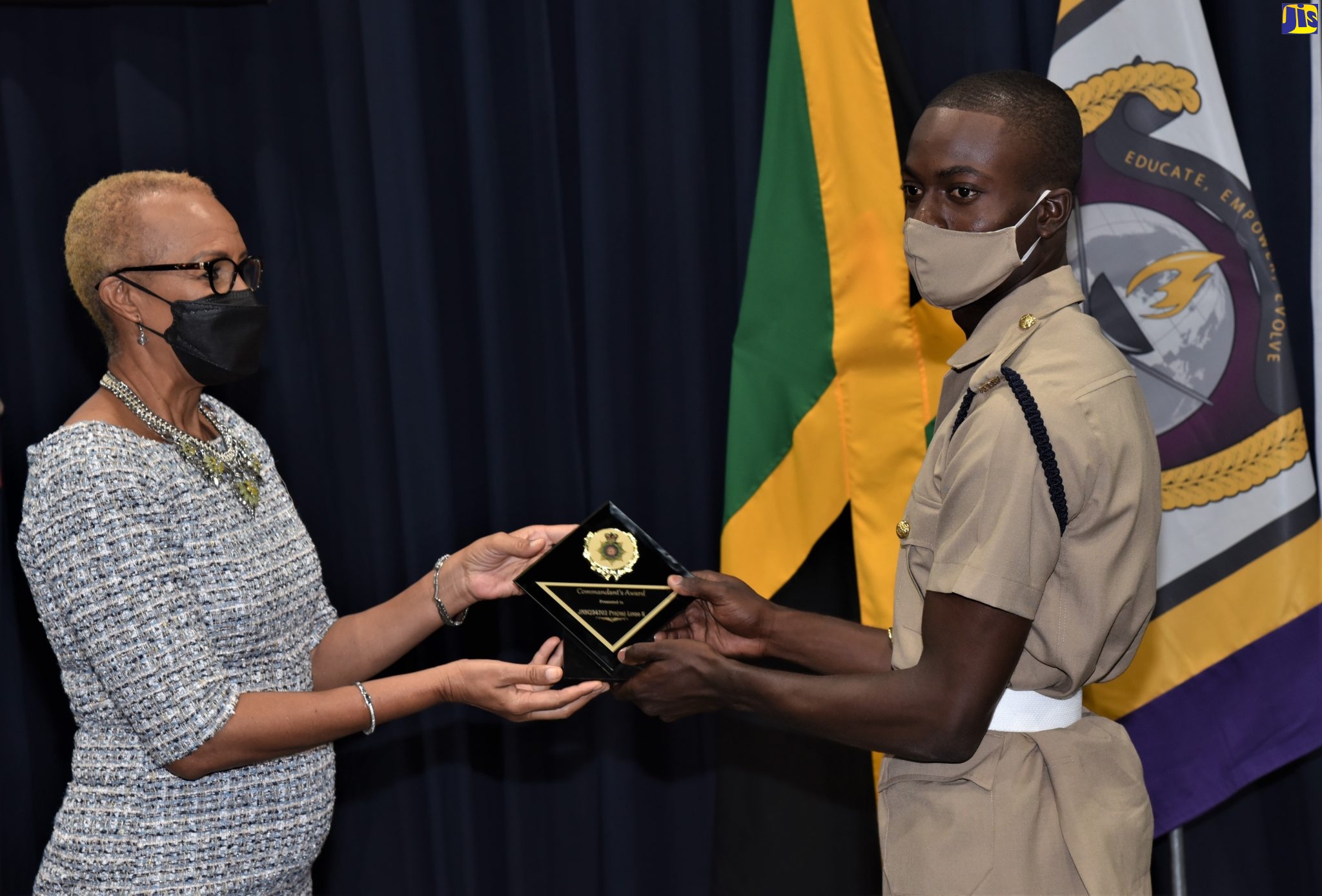 Minister of Education and Youth, Hon. Fayval Williams (left), presents the Commandant’s Award to Jamaica National Service Corps (JNSC) recruit, Kymni Lindo, at the Presentation of Certificates Ceremony for JNSC Intake 2021/01, held on Tuesday (March 8), at Up Park Camp in St. Andrew.