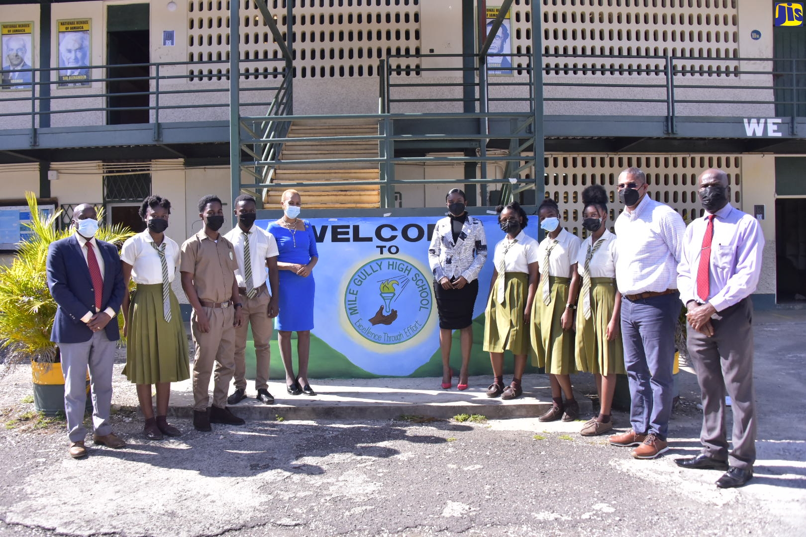 Minister of Education and Youth, Hon. Fayval Williams (fifth left), with several students of the Mile Gully High School during her visit on March 18. Also with the students (from left) are Principal, Christopher Tyme; Chairwoman of the school’s Board of Governors, Simone Scarlett; Member of Parliament for Manchester North West, Mikael Phillips and Vice Chairman of the school’s Board of Governors, Dennis Daley.