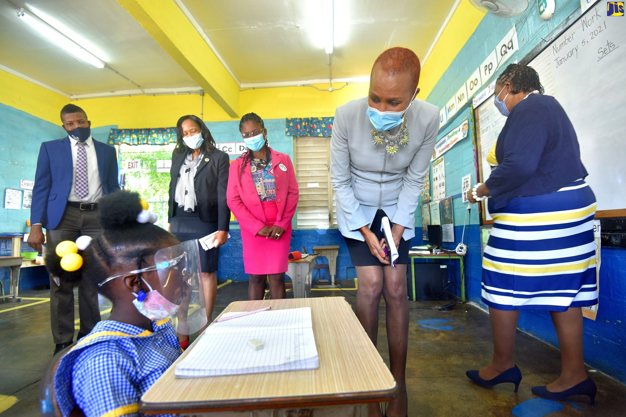 Minister of Education, Youth and Information, Hon. Fayval Williams, (second right) engages with Seaward Primary & Junior High School student, Shardanaye Crawford (left), during her visit to the institution on Tuesday (January 5). Looking on (in background from left) are Education Officer, Ricardo Kennedy; Acting Regional Director, Region 1, Dasmine Kennedy; Vice Principal, Seaward Primary & Junior High School, Carol Gordon Marshall; and Principal, Arlene Thomas.